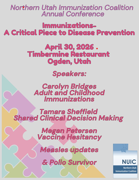 The Northern Utah Immunization Coalition was formed in 1993 to address the low immunization levels among two-year-olds in the northern counties of Weber, Morgan, and Davis. The Coalition’s mission is to promote early childhood and adolescent immunizations and educate the community through effective action and leadership. Adult activities are also included. It is comprised of a chairperson and individuals representing county/city schools, pediatrician’s offices, childcare centers, the Ogden Junior League, the PTA, the local health department and the local hospital.